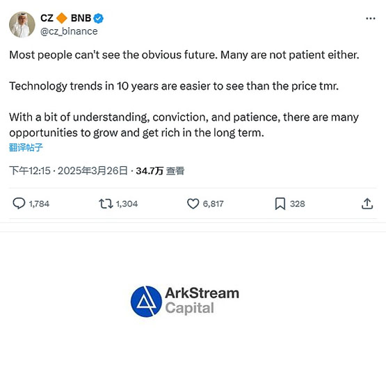 引用 CZ 最新推文:“十年的科技趋势比明天的价格更容易预测。大多数人看不清显而易见的未来,也缺乏耐心。”