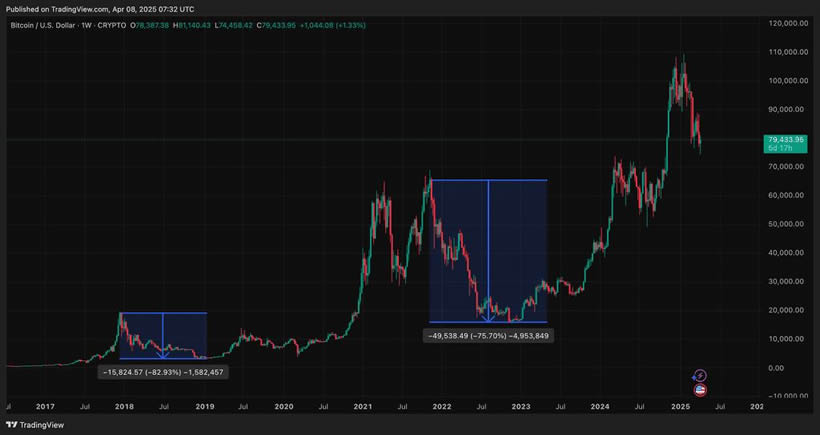 从历史数据来看,比特币的熊市通常出现在减半后的调整期或全球经济动荡时。例如,2018年的漫长熊市和2022年的加密寒冬都伴随着价格从高点暴跌70%-80%,并持续数月甚至数年。
