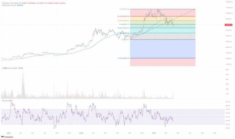 截至今日,比特币价格在过去几周内表现出较大的波动性。如果价格跌破200天移动均线(一个被广泛关注的长期趋势指标)或前低点(如2024年某个关键支撑位),技术派可能会将其视为熊市信号。然而,单靠技术指标并不足以得出结论。比特币市场的周期性波动往往受到外部事件驱动,而非单纯的技术形态。
