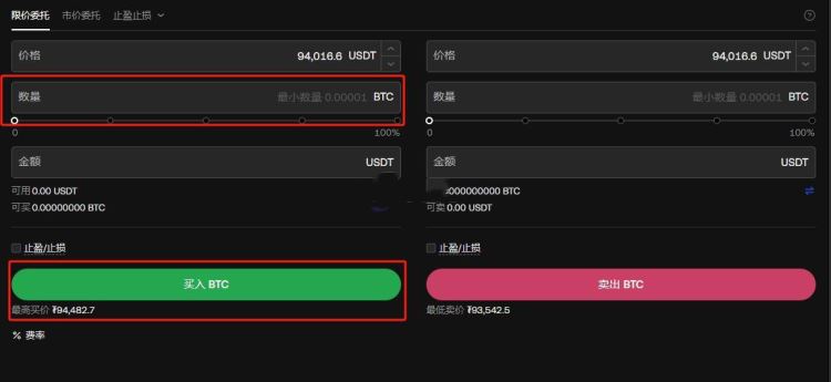 - 在交易界面选择BTC/USDT等交易对,下单购买。