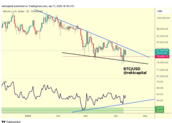 BTC/USD日线图与RSI数据。来源:Rekt Capital/X