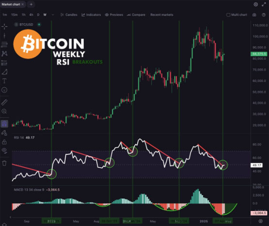 BTC/USD周线图与RSI数据。来源:Kevin Svenson/X