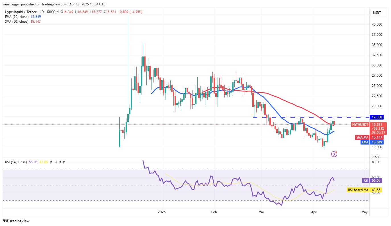4月11日,$HYPE收盘价站上50日均线(15.14美元),并于次日触及17.35美元阻力位。日线图显示,20日EMA(13.84美元)开始走强,相对强弱指数(RSI)升至56,多头占优。若突破17.35美元,目标价或指向21美元,进一步挑战25美元。反之,若跌破20日EMA,可能回踩12美元支撑。