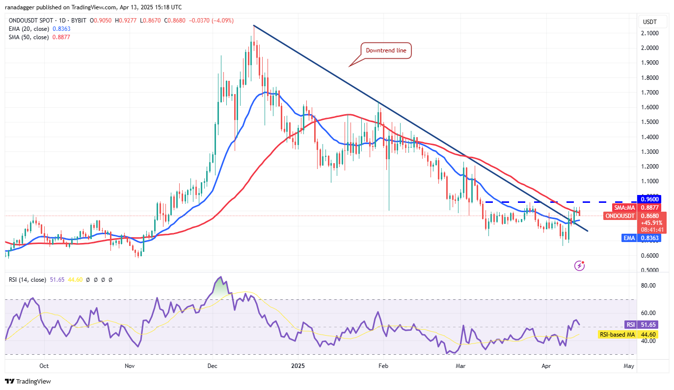 $ONDO已突破下降趋势线,空头压力减弱。当前在0.96美元处面临卖压,但20日EMA(0.83美元)提供支撑。若从该均线反弹,有望再次测试0.96美元以上区域。成功突破后,目标价或达1.2美元。若回落至20日EMA下方,则可能下探至0.79美元,甚至0.68美元。