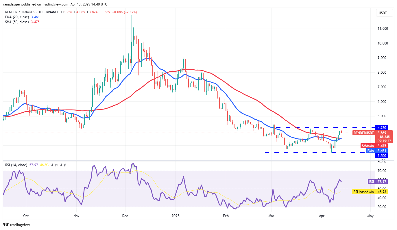 $RENDER逼近4.22美元阻力位,空头正在积极防守。日线图中,20日与50日均线即将形成黄金交叉,配合RSI进入买入区域,技术面偏多。若突破4.22美元,将完成双底形态,目标价可达5.94美元。若失守3.47美元关键均线,或将在3.46至3.475美元区间震荡。