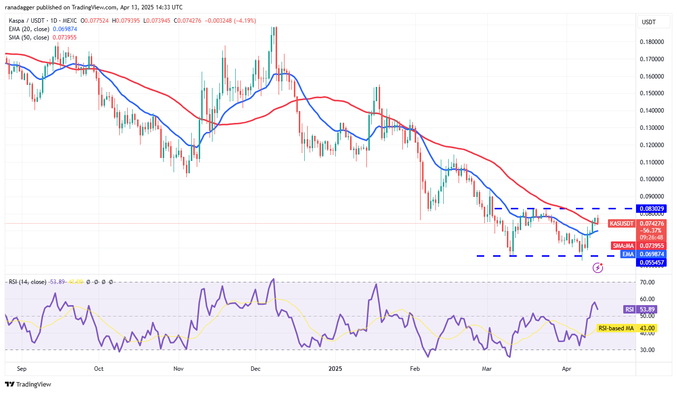 4月12日,$KAS收盘站稳50日均线(0.07美元),显示卖压减轻。20日EMA已转向上行,RSI进入买入区域,后市看涨信号增强。若突破0.08美元,将完成双底形态,目标价为0.12美元。若跌破0.07美元,可能陷入0.05至0.08美元的区间震荡。