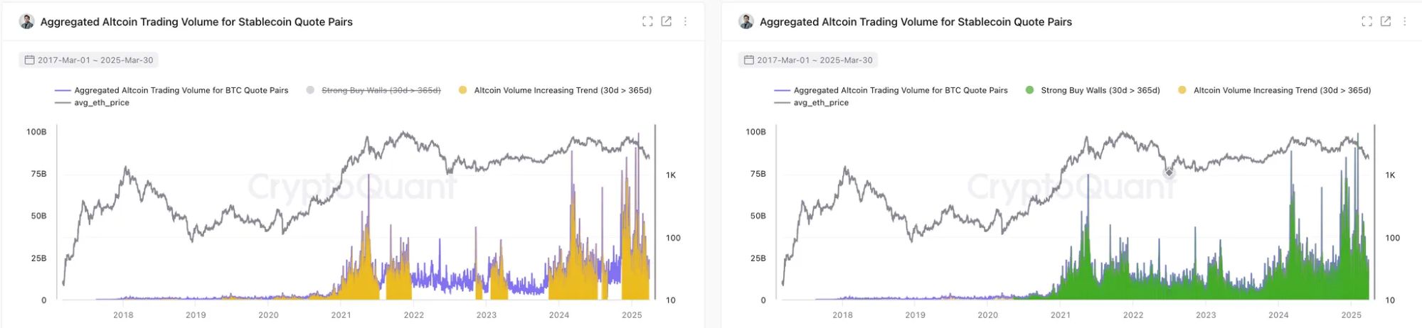数据显示,2024年末至今,稳定币报价对的山寨币交易量持续高于历史均值,且大户建仓信号频繁出现。这说明无论是散户还是机构,都更倾向使用稳定币进行高频轮动操作。