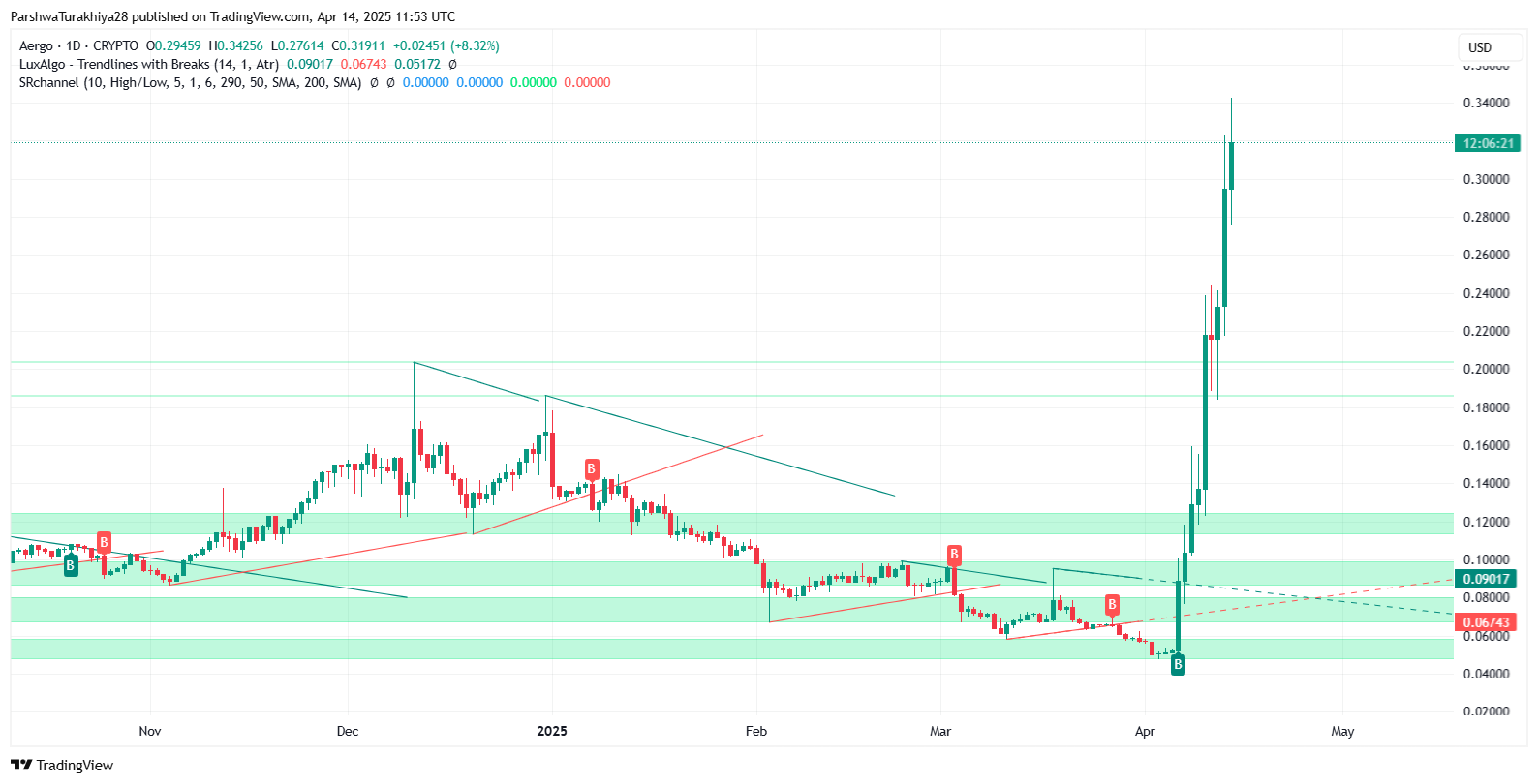 价格强势突破0.0900美元阻力位,突破长期趋势线,形成爆发式上涨。当前站稳0.3200美元上方,若持续放量,有望挑战0.3600美元。回调支撑关注0.2200–0.2500美元区域。