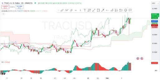另一方面,我们看到平均方向指数 (ADX) 位于 40.36,这是一个相对较高的水平,表明趋势强劲。高于 25 的数值通常表示趋势强劲,因此 40 的读数表明这种上升势头已经确立。只要价格保持在 50 日移动平均线 (SMA) 上方,趋势就会保持看涨。收盘价高于近期高点 0.6465 左右,可能预示着上升趋势的延续。如果价格未能保持在 50 日移动平均线 (SMA) 上方,并开始跌破 100 日移动平均线 (SMA),则可能预示着动能减弱,并可能出现趋势逆转。OriginTrail(TRAC)价格预测:Ichimoku Cloud