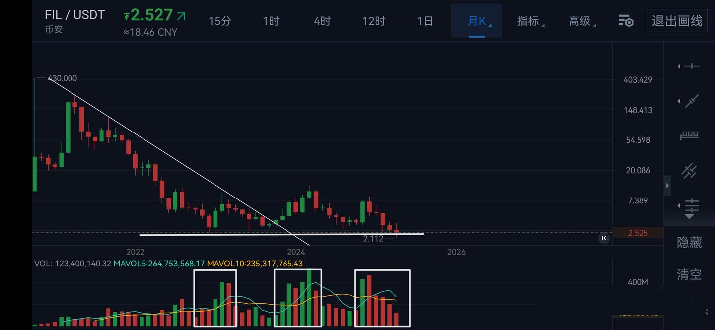 回望2021年5月,当FIL价格冲至160至200美元区间时,无数投资者仍抱有幻想,即便在高位也不断买入。彼时,1T矿机一度被抢购一空,市场情绪达到极致。然而,随着熊市来临,价格从70、60、50美金一路下滑,直至今日的2美元,许多早期持有者深陷其中,感情与资金双重受伤。