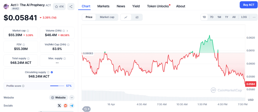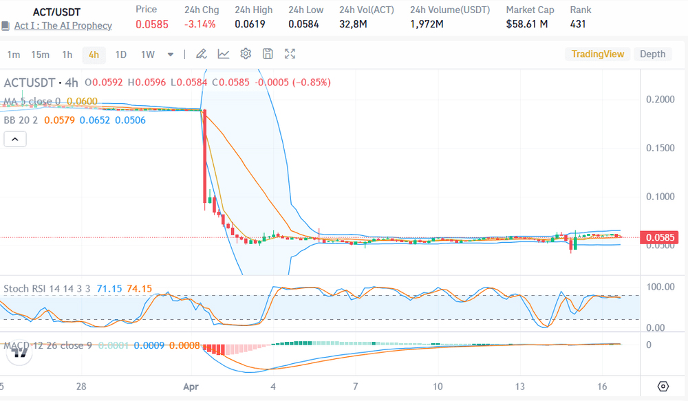 截至2025年4月17日,ACT交易价格约为$0.0585,市值约$5861万美元,24小时交易量接近197.5万美元。从技术面看,该代币正处于价格整合阶段,此前经历明显回调。当前恐惧与贪婪指数为38,反映出市场普遍持谨慎态度。