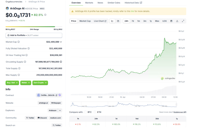 AIDOGE,也被称为ArbDoge AI,近期成为市场焦点。根据最新数据,其价格在24小时内暴涨82.5%,从$0.00000009037升至$0.0000001731,最高触及$0.0000001852,24小时交易量达3800万美元,显示强劲的市场动能。