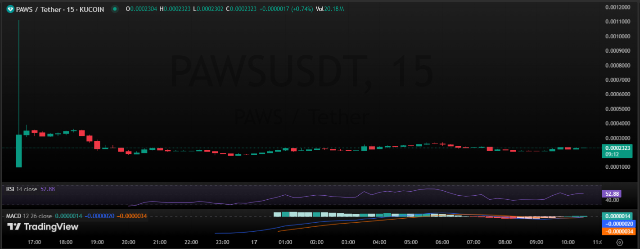 根据最新数据,PAWS代币的交易价格约为0.0002324美元,总市值接近1342万美元。尽管价格基数极低,但交易量始终保持高位。在发行首日,价格曾短暂冲高至0.0012000美元,随后进入0.0001900至0.0002400美元区间震荡整理。 关键技术指标显示: - RSI:52.47(处于中性区域,无明显超买或超卖) - MACD:形成轻微看涨交叉,预示潜在上行动能 - 支撑位:0.0001700美元,为短期关键防线 - 阻力位:0.0002400美元,突破后目标指向0.0004000美元 短期走势取决于0.0002400美元关口的成交量配合情况。一旦有效突破,可能引发新一轮上涨行情;反之,若跌破0.0002000美元,则将考验0.0001700美元的支撑力度。