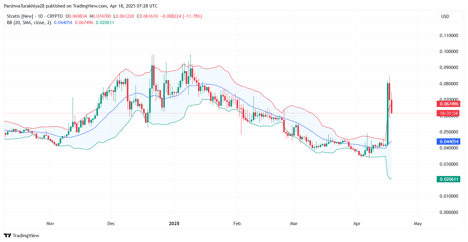 STRAX价格在经历数周盘整后突破布林带上轨至0.0675美元,但缺乏成交量支撑,随即回落至0.0600美元附近。中线(20日均线)位于0.0440美元,下轨为0.0206美元,显示短期波动加剧。 MACD指标完成看涨交叉,柱状图扩张,绿色动能强劲,表明趋势向上确认。然而若出现背离或动能衰减,可能触发反转。 相对强弱指数(RSI)目前为61.93,处于中性偏强区域,尚未进入超买区。若能稳定高于60,则强化看涨信号;反之若下行则需警惕回调风险。关键支撑与阻力位