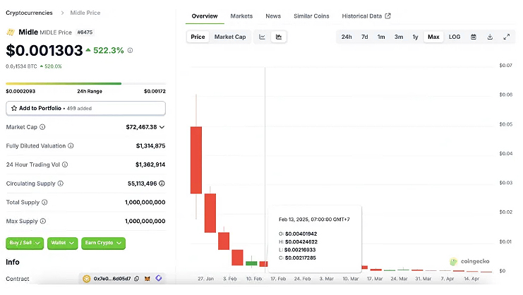 Midle代币的价格经历了极端的周期性变化。2025年初,随着平台采用率提升和代币效用增强,价格一度触及$0.06086的历史峰值。然而,同年4月,受市场整体情绪影响,价格暴跌至$0.00019的低位。这反映了其对宏观市场环境和投资者情绪的高度敏感性,也凸显了其作为高风险、高回报投资标的的特性。如何获取与交易Midle代币?