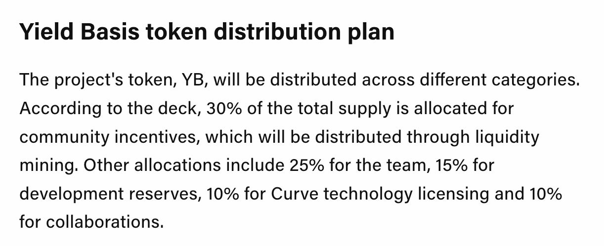 Yield Basis发行总量为10亿枚YB代币,其中1亿枚(10%)在首轮融资中售出,融资额达500万美元,估值5000万美元。该轮认购需求超过预期15倍,反映出市场对项目潜力的高度认可。