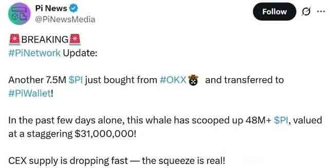 在过去的 48 小时内,鲸鱼钱包已从OKX 等中心化交易所提取了数千万个 PI 币,分析师通常将此举解读为积累的迹象,而不是即将抛售的迹象。