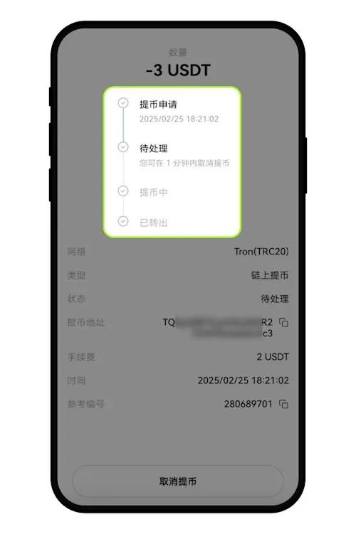 若您在“提币申请”或“待处理”状态下,于1分钟内主动取消提币操作,系统将自动撤销并退款至您的账户。一旦进入“提币中”阶段,无法撤销,请谨慎操作。4、手续费影响到账速度