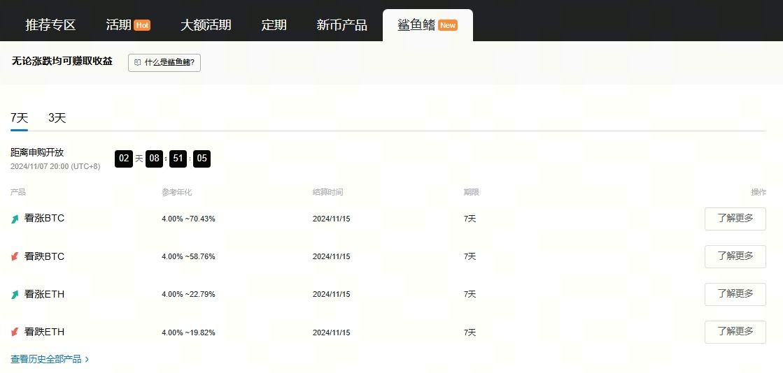鲨鱼鳍是一款基于期权机制设计的结构性理财工具,收益曲线形似鲨鱼鳍,具备无本金损失、基础收益保障和浮动回报特点。根据市场走势判断准确度决定最终收益水平,适合稳健型投资者、追求超额收益者、新手体验者以及期权初学者。
