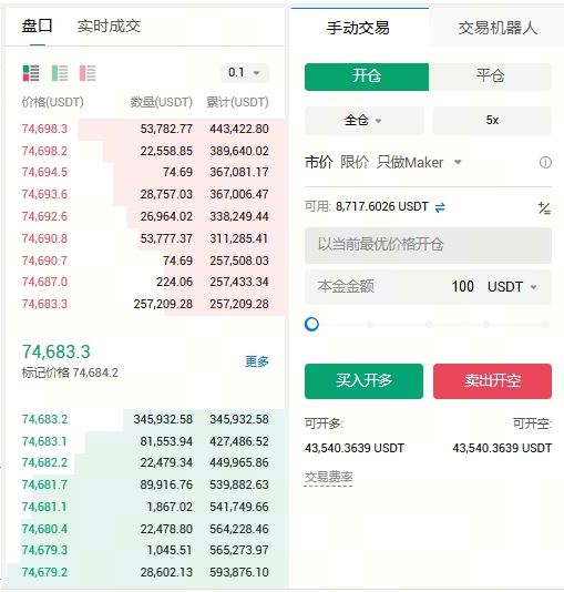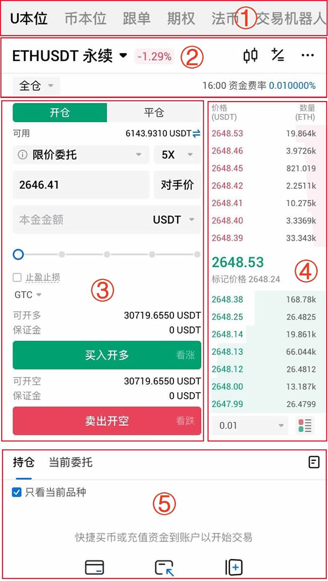 3. 点击“开仓”,选择市价委托;调整杠杆倍数至5倍;输入开仓金额如100 USDT;根据判断点击“买入开多”或“卖出开空”。注意:账户需有足够USDT余额,否则需提前划转。