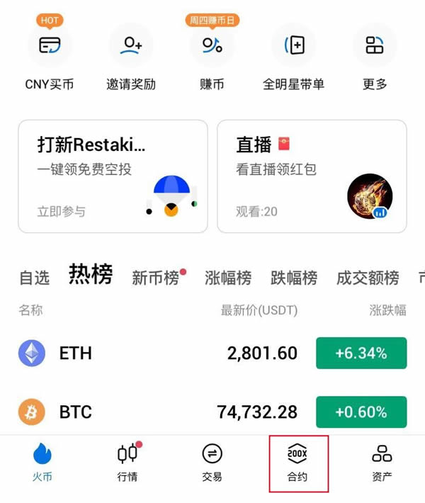 1. 打开火币官方app并登录账号,点击底部导航栏的“合约”进入交易页面。