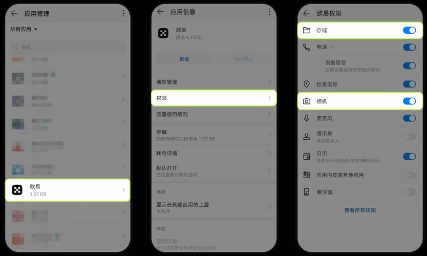 进入【设置】-【应用】-【应用管理】,查找并点击【欧易】;在应用详情页中选择【权限】;在权限列表中,确保【存储】和【相机】开关处于开启状态,完成设置。