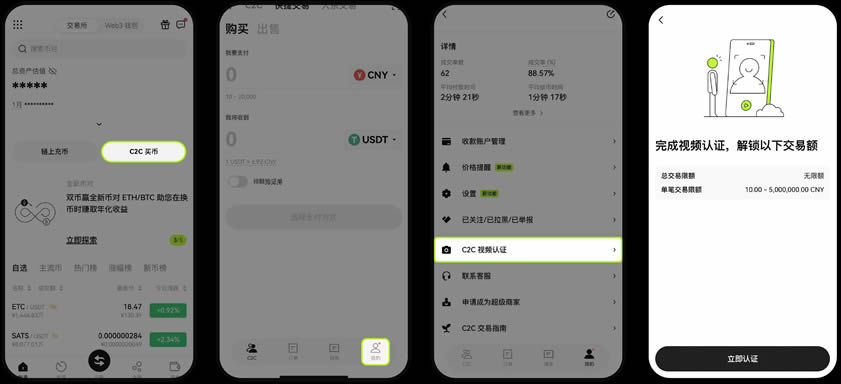 视频认证用于提升C2C交易安全性。路径为:首页点击【C2C买币】→【我的】→【C2C视频认证】→【立即认证】。请保持摄像头开启、声音正常,避免使用耳机。系统将朗读风险提示,您无需跟读。在听到“嘀”声后,明确回答【是的】,随后提交资料等待审核。