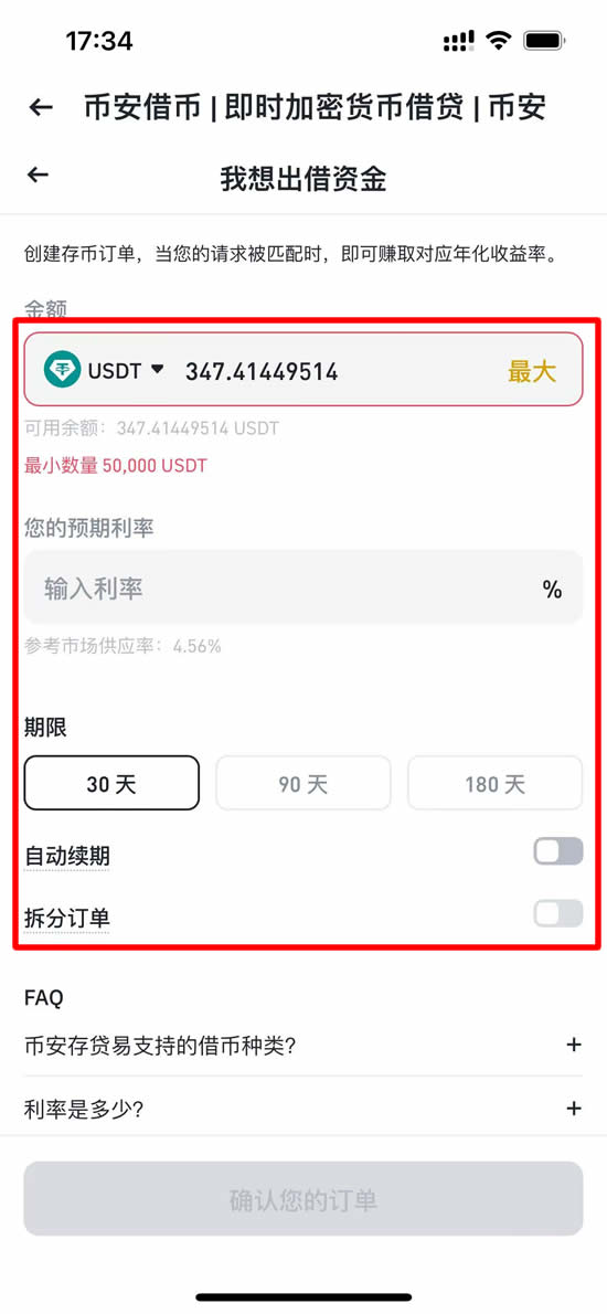 - 数量:输入希望出借的币种与金额,最低50,000美元等值。