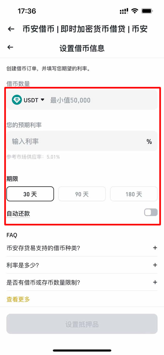 点击「借币」进入订单设定页。