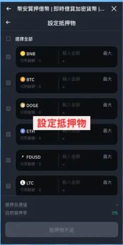 设定完成后点击「设定抵押物」,从支持币种中选择用于抵押的资产。