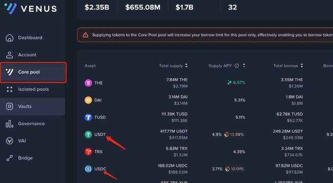 进入 app.venus.io,连接钱包后选择「Core Pool」,存入USDT或USDC,并勾选「Collateral」激活抵押功能。随后选择BNB,点击「Borrow」,输入借款数量,确认交易即可完成。