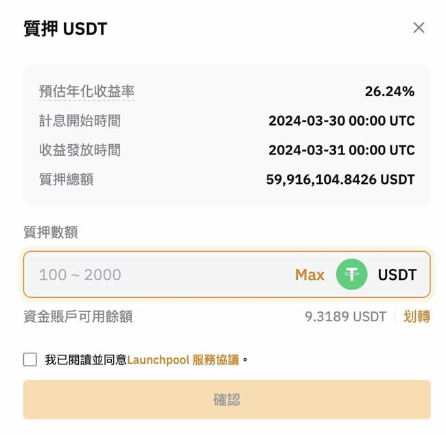 选择你希望质押的币种(如 $USDT、$BTC 等)并存入对应资产池。质押金额越大,获得的代币配额越高。