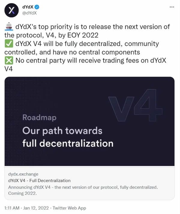 据官方公告,dYdX计划在2022年第四季度推出V4版本,实现全面去中心化。
