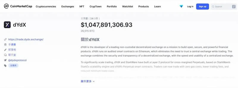 根据CoinMarketCap数据,截至截稿前,dYdX 24小时交易量已超10亿美金,仅次于Uniswap V3,凸显其在衍生品市场的领先地位。