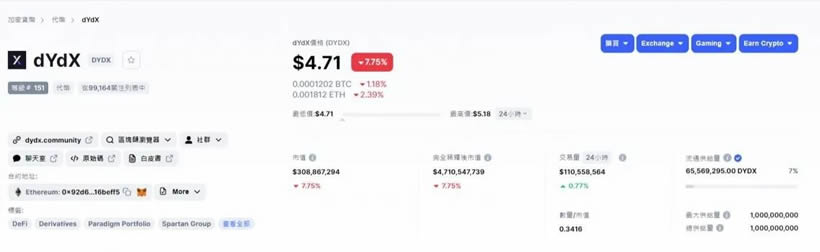 截至截稿,$DYDX价格为4.71美元,较2021年10月高点27.8美元回落逾83%。除整体市场回调影响外,代币供给过快释放成为关键压力。