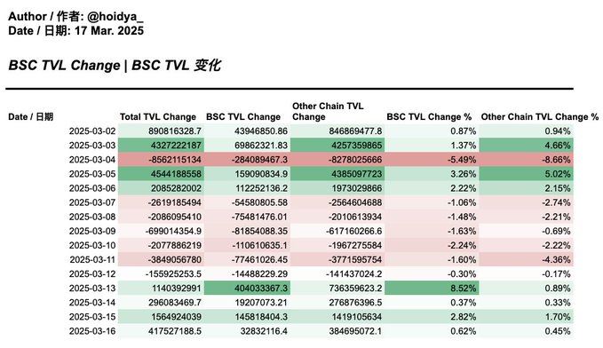 从链上总锁仓价值(TVL)看,BNB Chain的流动性自3月13日起明显攀升,主要受MGX投资消息影响。这表明市场对币安生态信心短期增强,资金开始向BNB Chain聚集。