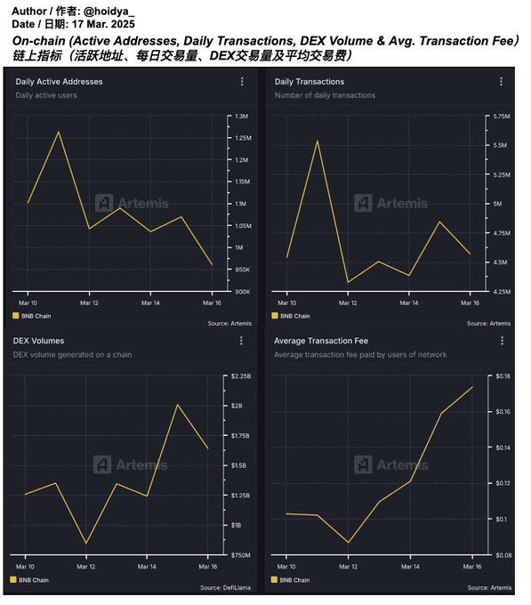 - 每日活跃地址:未因MGX消息出现大规模新增,仅在3月13日和15日各增加约50万地址,整体呈平台或回落趋势。 - 每日交易量:经历3月11日暴跌后,于15日回升至4.8百万美元,显示短期交易情绪回暖。 - DEX交易额:分别在13日和15日录得约500万美元与750万美元增量,反映交易活动集中爆发。 - 交易手续费:自3月12日后持续上涨,从0.1美元升至0.18美元,说明链上拥堵加剧,用户支付意愿提升。