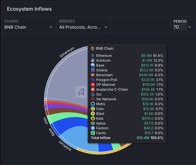 近7天内,超过61%的跨链流动性来自Ethereum生态,而Solana仅占5%。这表明当前主流资金仍集中在EVM兼容链,而非BNB Chain的潜在替代生态。
