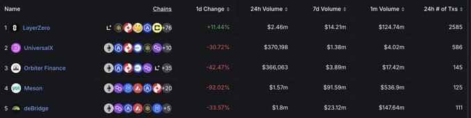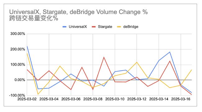 UniversalX的交易额增幅显著,与上周末的BSC Meme浪潮高度相关。相比之下,Stargate与deBridge的增长较为平缓,说明单纯提供跨链通道的协议,在缺乏明确应用场景时难以吸引增量流量。