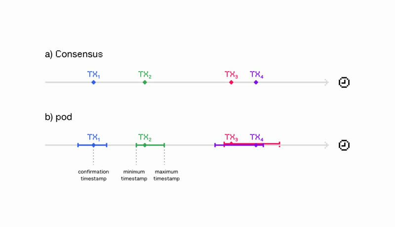 Pod Network采用一种全新的系统设计:交易以流式方式传输至一组验证者,由其生成证明并打上时间戳,无需区块、链结构或复杂共识协议。其输出为一个日志形式的交易序列,而非传统区块链的严格全序排列。