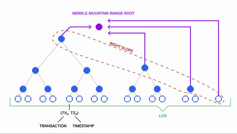 为降低存储门槛,验证者无需保存完整历史日志。系统采用默克尔山岭树(Merkle Mountain Range, MMR),每片叶子对应一笔交易及时间戳。验证者只需维护MMR的最新峰值,即可动态更新并广播认证根与时间戳。新交易到来时,仅需计算当前斜坡即可生成新根,极大减少存储开销。