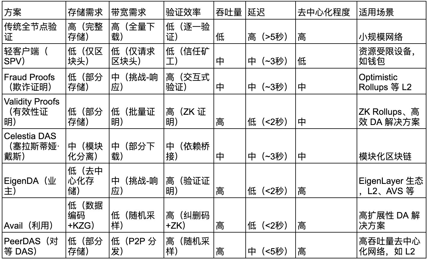 在区块链领域,常见的数据可用性(DA)方案包括传统全节点验证、DAS、以及中心化存证等。相较之下,PeerDAS在存储开销、验证效率与去中心化水平上具备明显优势。