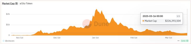 - **区块链平台**:Solana - **历史最高价**:2.34美元 - **市值**:截至3月16日约为2.26亿美元 - **流通供给量**:约10.99亿枚 $Ai16z