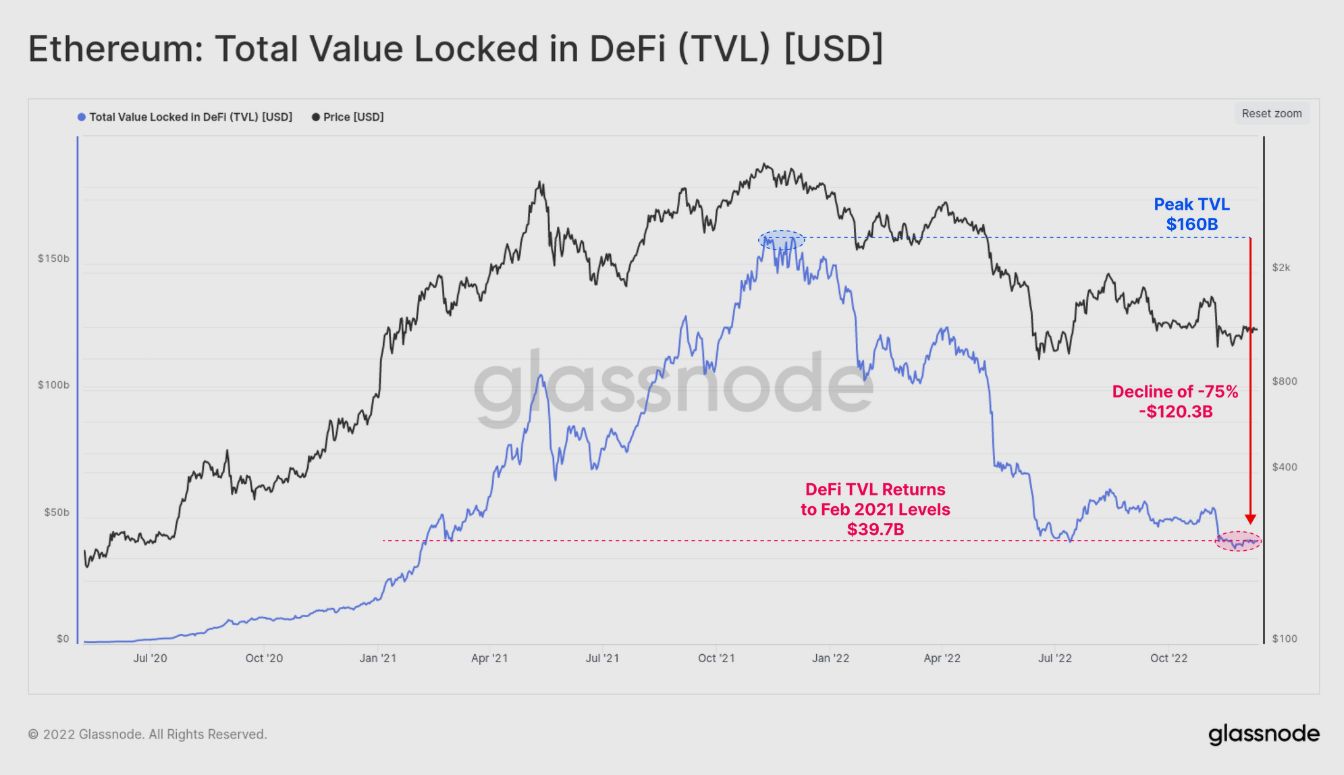 2022 年 DeFi TVL 大幅下跌(来源:Glassnode)
