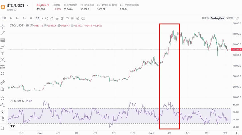 如上图所示,BTC 日线图中,在今年 1 月底到 3 月中旬期间,BTC 开启了一段强势上涨的趋势行情。尽管 BTC 日线 RSI 一度触及 80,但上涨途中回撤很少,上涨动能强劲。直到 3 月中旬,日线 RSI 在持续保持接近 90 的高位后,最终完成趋势反转,震荡下跌。