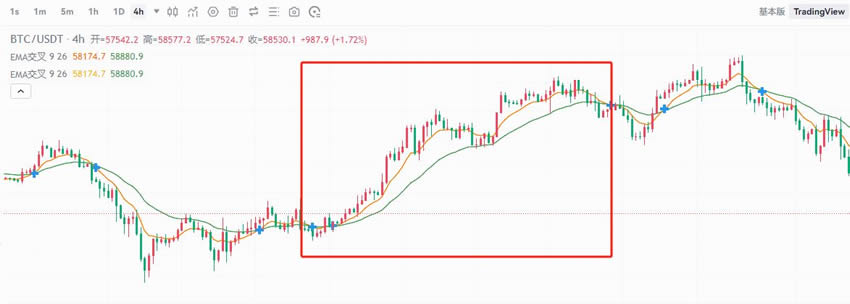 如下图所示,BTC 4 小时图上的 9 日 EMA 从下方穿过 26 日 EMA 后,BTC 短期进入上涨趋势。该交叉点被称为“金叉”,通常视为买入信号。反之,交叉点会被称为“死叉”,通常被视为卖出信号。