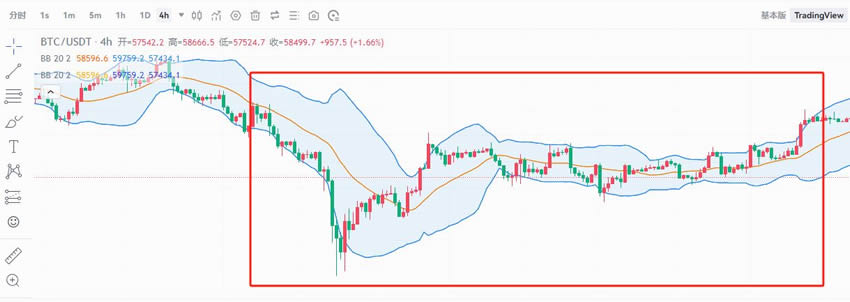 如下图所示,BTC 4小时图,其价格走势一直在下轨和上轨之间波动。
