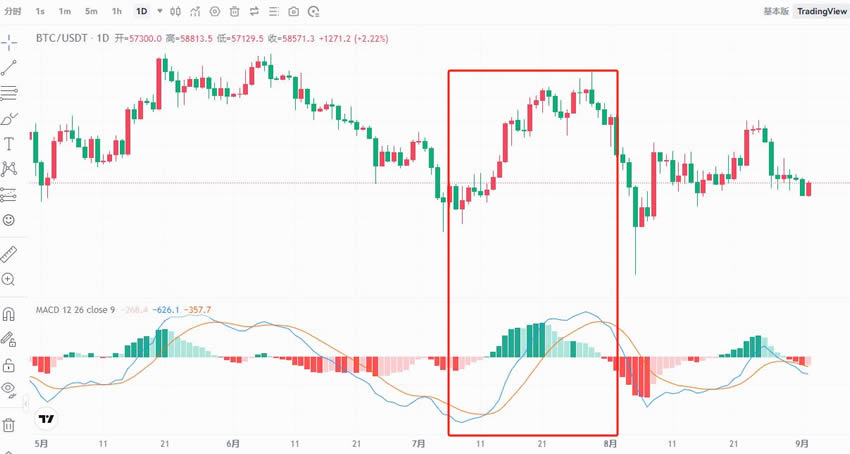 举例,如下图红框中所示,BTC 日线图上的 MACD 线上穿信号线,同时 MACD 柱状图转为正值,此时 BTC 上涨动能增强,持续上涨。