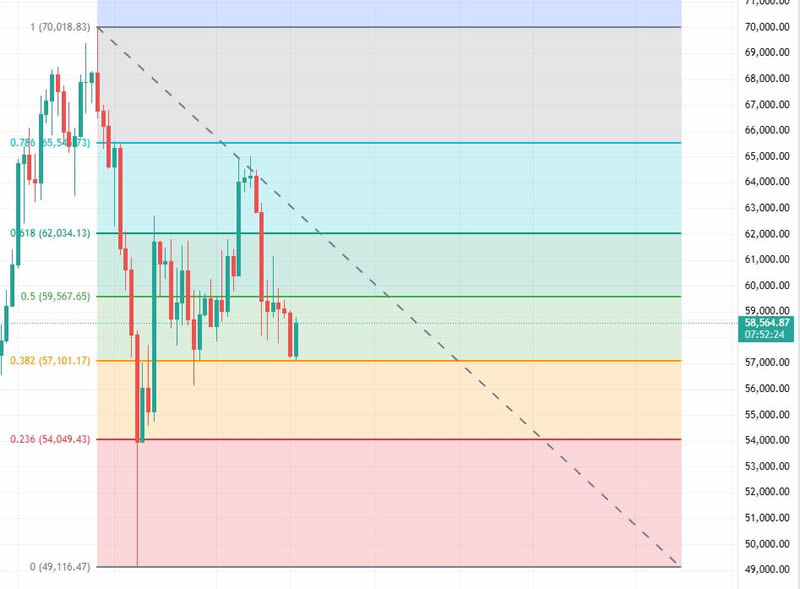 例如,在 BTC 最近一次大跌中,价格从 70,018 美元跌至 49,116 美元。根据斐波拉契常用水平,BTC 后续反弹的时候,在 38.2% 位置多次获得支撑, 61.8% 位置成为反弹阻力位。