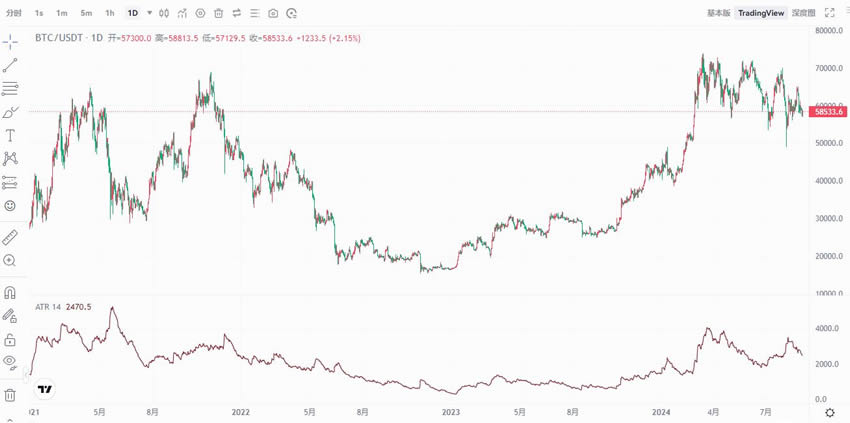 比如,BTC 此时的价格是 58,500 美元,日线 ATR 为 2470,这意味着 BTC 的日均价格波动约为 2470 美元,那么此时可以将止损点设在入场价格减去 2 倍 ATR 的位置,约为 53560 美元(58500-2470*2)。